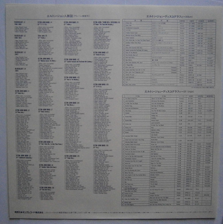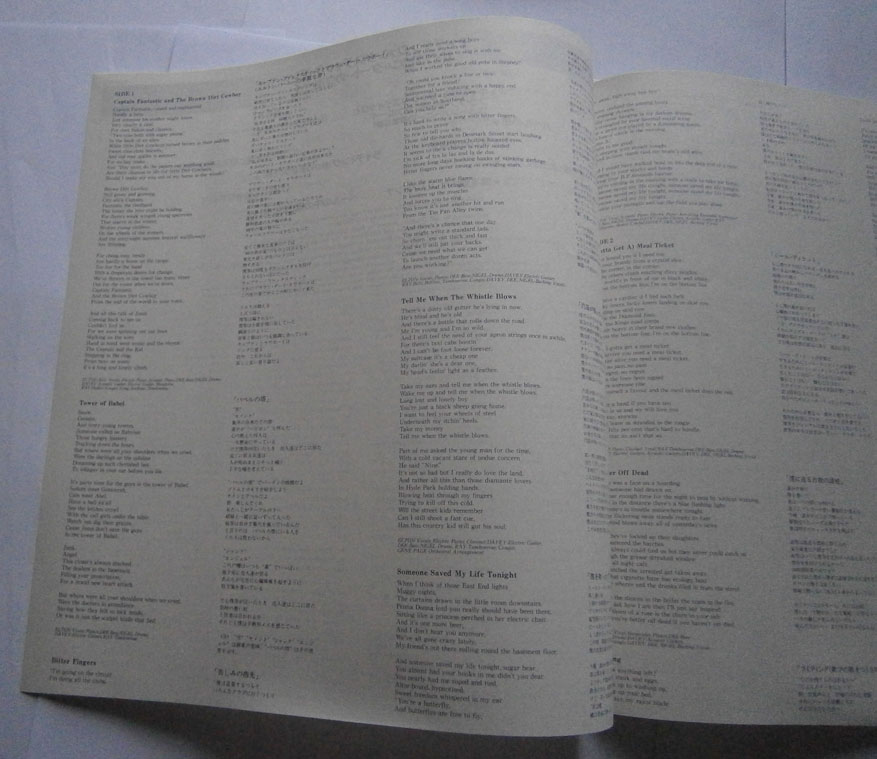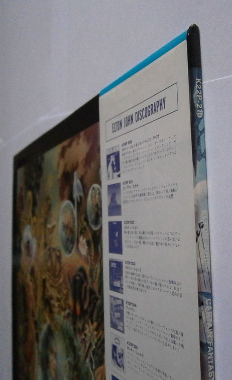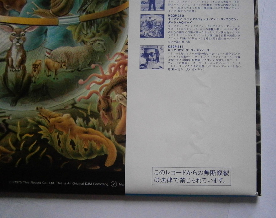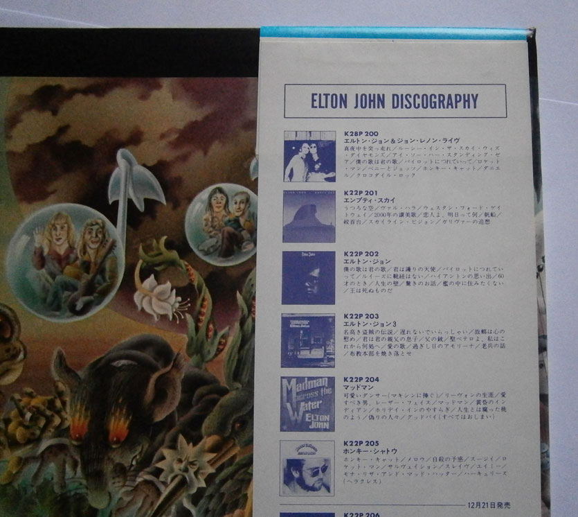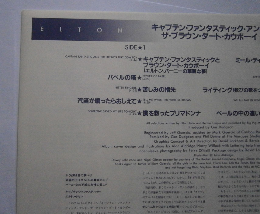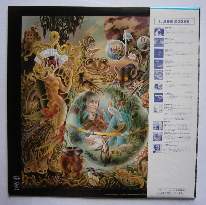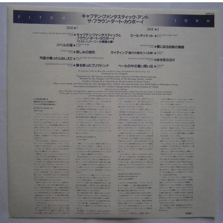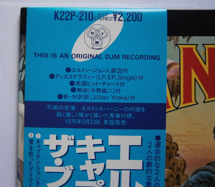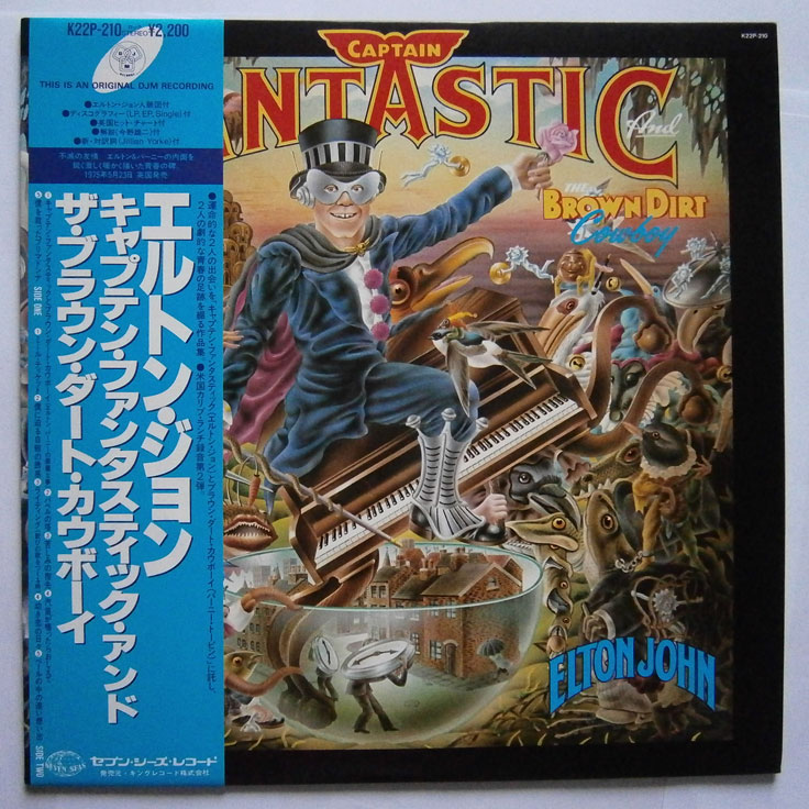 ELTON JOHN / CAPTAIN FANTASTIC AND THE BROWN DIRT COWBOY エルトン・ジョン / キャプテン・ファンタスティック (LP-0241) エルトン・ジョンの「キャプテン・ファンタスティック」は1975年リリースのアルバム。 エルトンとパーニーのデビューまでの事をモチーフにしたコンセプトアルバム。 ジャケット、盤ともコンディション良好です。帯の裏にシワあります。 盤区分 : LP オリジナル型番 : K22P-210 在庫状態 : 売り切れ ¥2,000(税込) 只今お取扱い出来ません