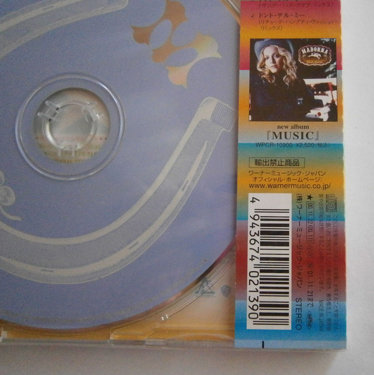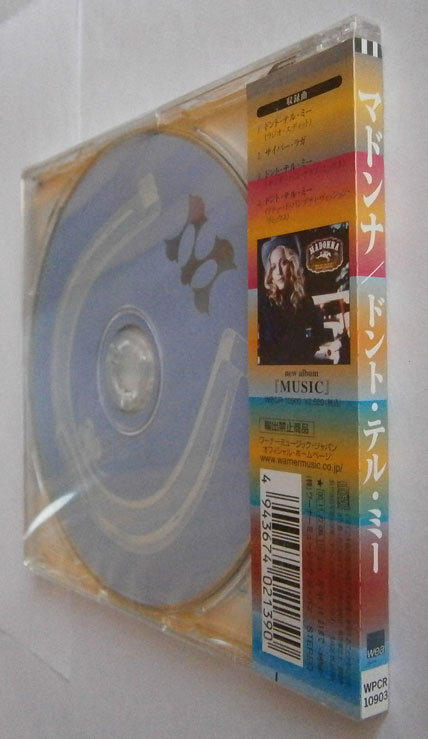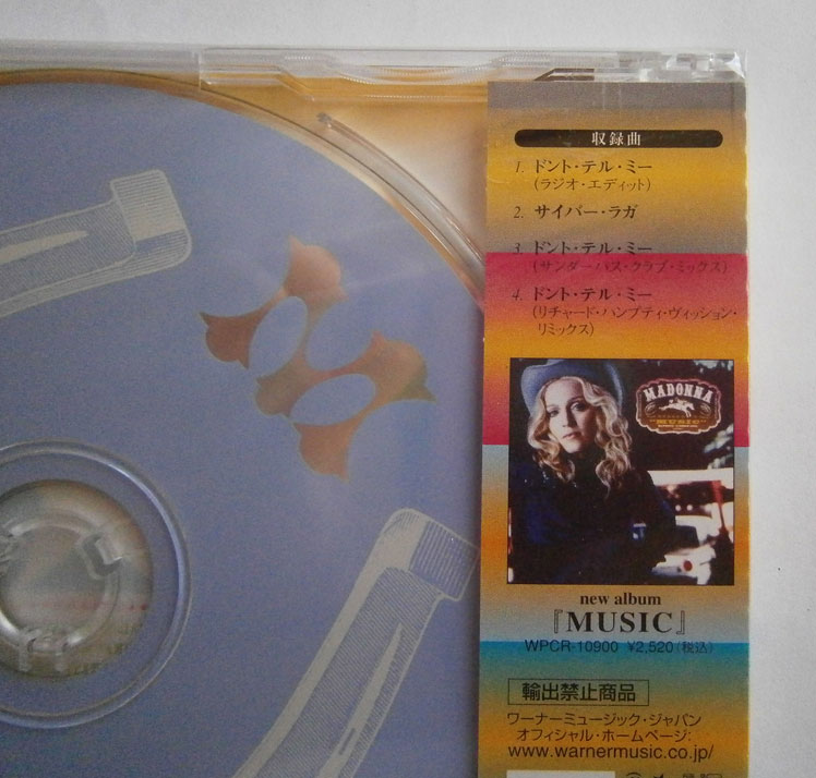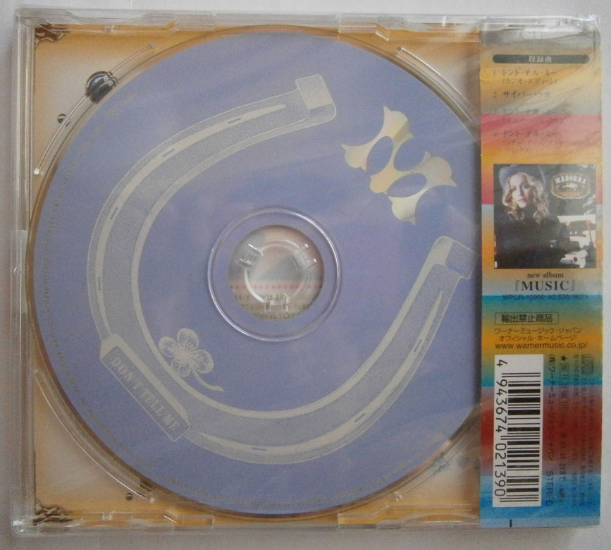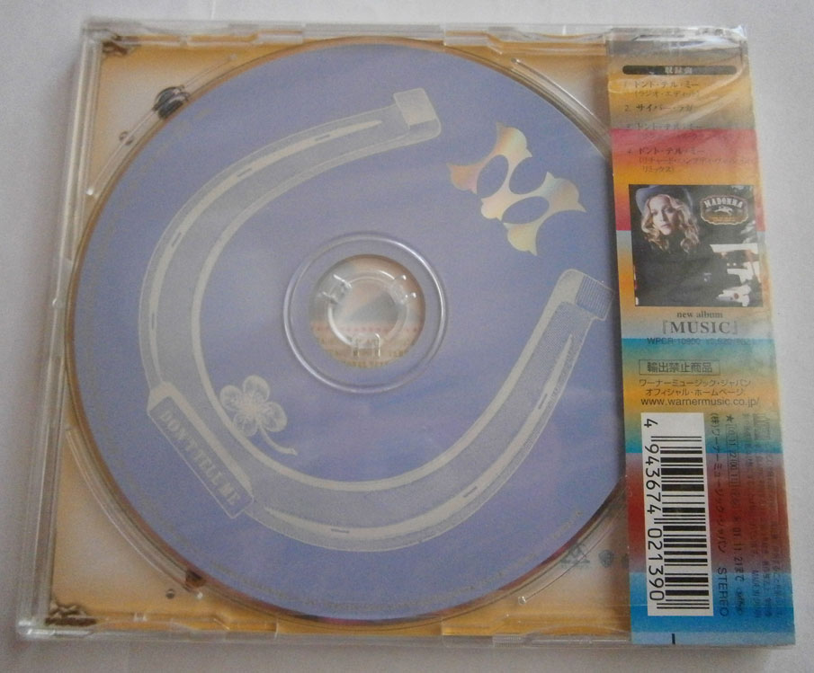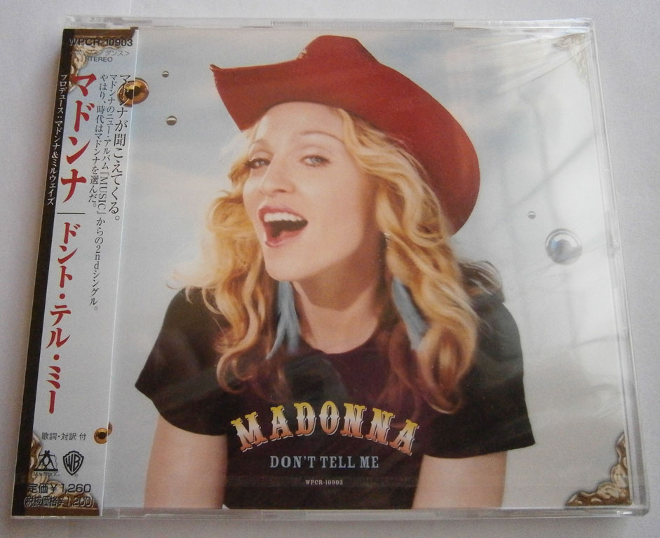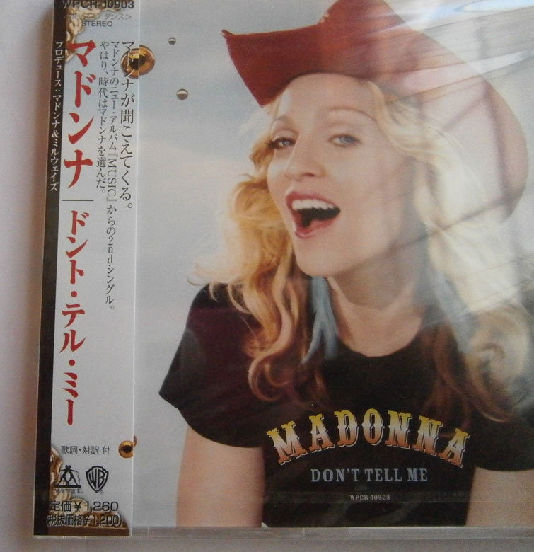 MADONNA / DON’T TELL ME マドンナ / ドント・テル・ミー (CD-0384) マドンナの「ドント・テル・ミー」は8作目の「ミュージック」からのシングル曲。 未使用品です。 盤区分 : CD オリジナル型番 : WPCR-10903 在庫状態 : 売り切れ ¥3,000(税込) 只今お取扱い出来ません