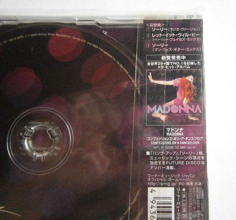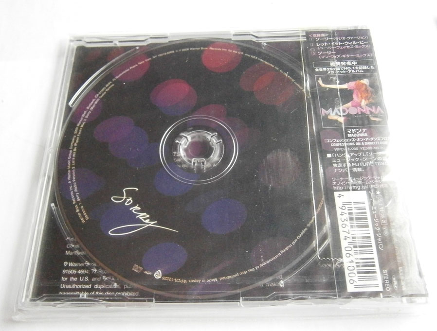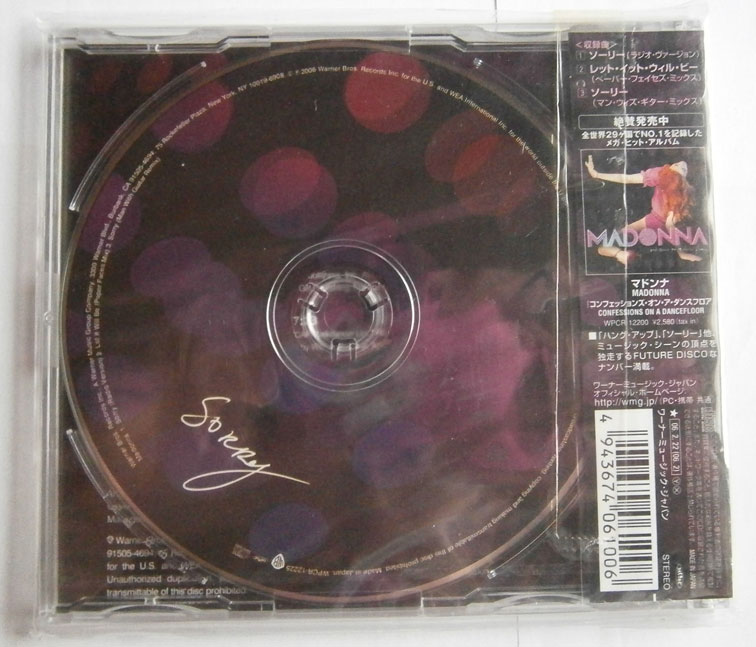 MADONNA / SORRY マドンナ / ソーリー (CD-0402) マドンナの「ソーリー」は2005年リリースの10作目のアルバム「コンフェッションズ・オン・ア・ダンスフロア」からのセカンド・シングル曲。 未使用品です。 盤区分 : CD オリジナル型番 : WPCR-12225 在庫状態 : 売り切れ ¥2,500(税込) 只今お取扱い出来ません