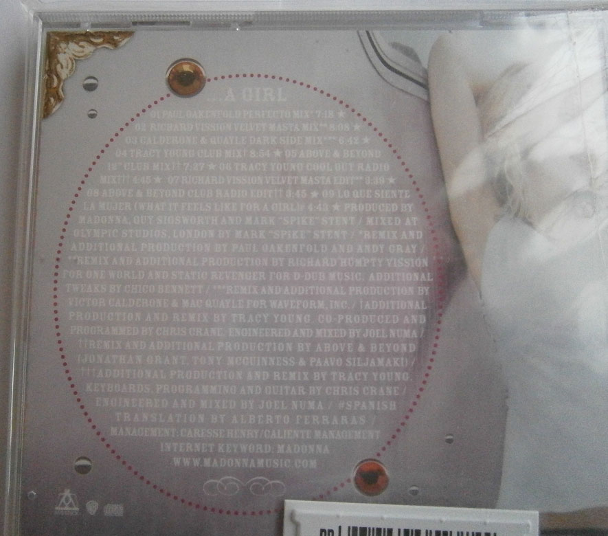 MADONNA / WHAT IT FEELS LIKE FOR A GIRL マドンナ / ホワット・イット・フィールズ・ライク・フォー・ア・ガール (CD-0405) 8作目の「ミュージック」からのシングル曲「ホワット・イット・フィールズ・ライク・フォー・ア・ガール」のリミックス・ミニ・アルバム。 未使用品です。 盤区分 : CD オリジナル型番 : WPCR-10906 在庫状態 : 売り切れ ¥3,300(税込) 只今お取扱い出来ません
