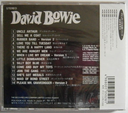 DAVID BOWIE / DAVID BOWIE デヴィッド・ボウイ / デヴィッド・ボウイ (CD-0253) デヴィッド・ボウイの記念すべきデビュー盤のCD化。別名「Love You Till Tuesday(ラヴ・ユー・ティル・チューズデイ)」。オリジナルは1967年作。 未使用品です。 盤区分 : CD オリジナル型番 : P25L 25027 在庫状態 : 売り切れ ¥2,500(税込) 只今お取扱い出来ません