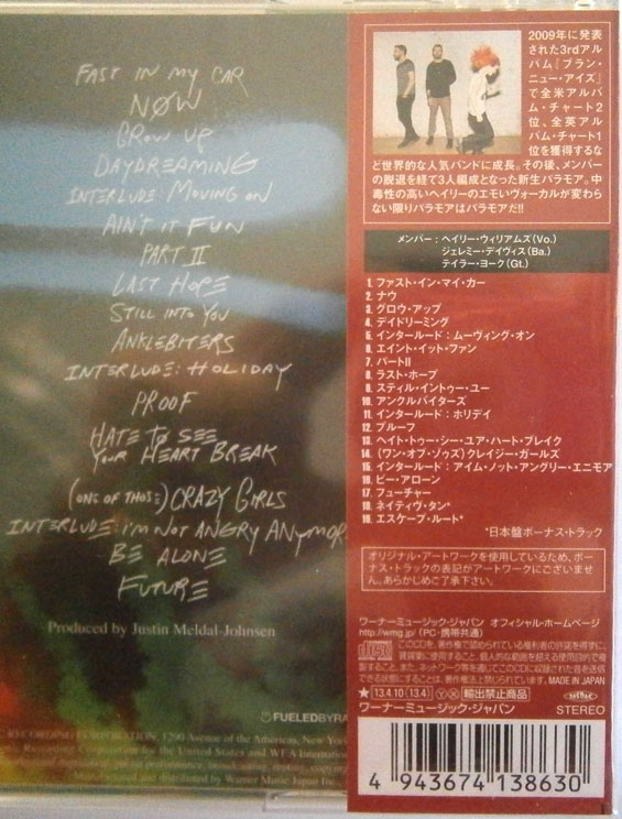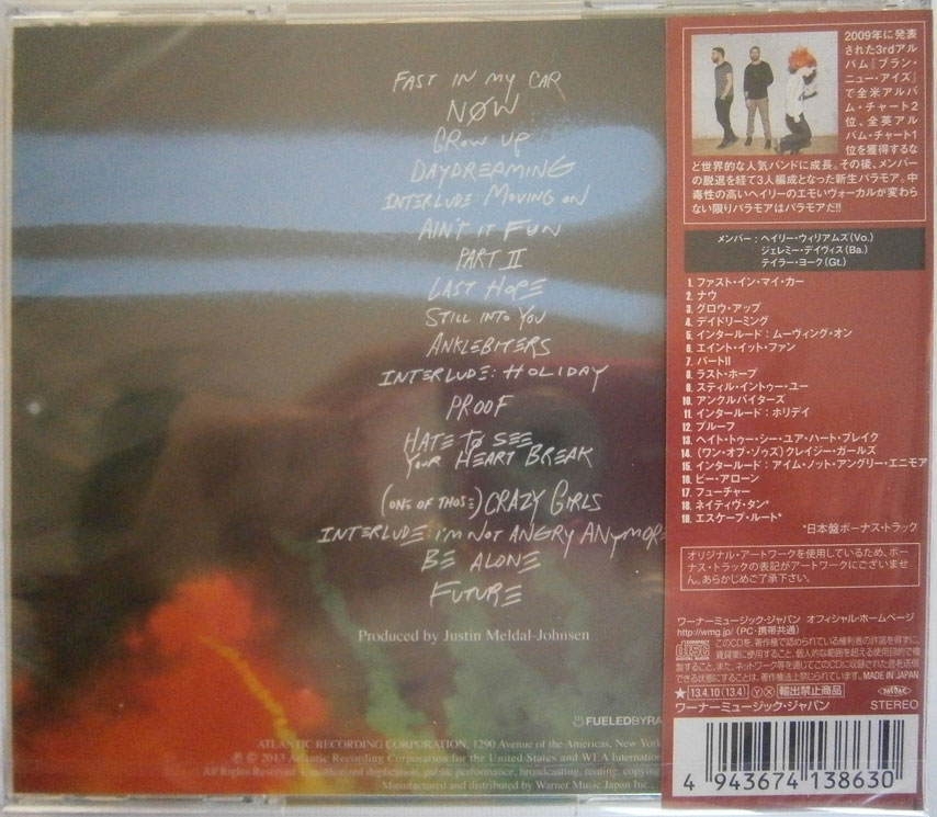 PARAMORE / PARAMORE パラモア / パラモア (CD-0261) トリオ編成となったパラモアの4作目。とはいえ、前作の勢いをそのまま、ますます磨きがかかった粒揃いの楽曲でこれぞガールズ・エモなサウンドを聴かせる。 未使用品です。 盤区分 : CD オリジナル型番 : WPCR-14900 在庫状態 : 売り切れ ¥1,900(税込) 只今お取扱い出来ません