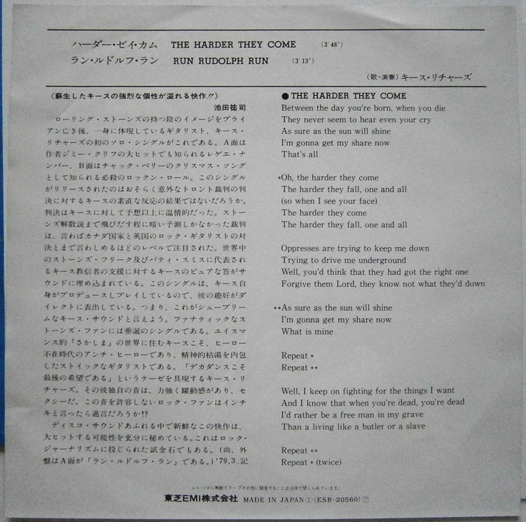 KEITH RICHARDS / HARDER THEY COME キース・リチャーズ / ハーダー・ゼイ・カム (EP-0067) ローリング・ストーンズのキース・リチャーズがレゲエの名作ジミー・クリフの「ハーダー・ゼイ・カム 」をカバーしたソロ作品。B面はチャック・ベリーの「ラン・ルドルフ・ラン」をカバー。 スリーブにシワがあります。 盤区分 : EP オリジナル型番 : ESR-20560 在庫状態 : 売り切れ ¥1,800(税込) 只今お取扱い出来ません