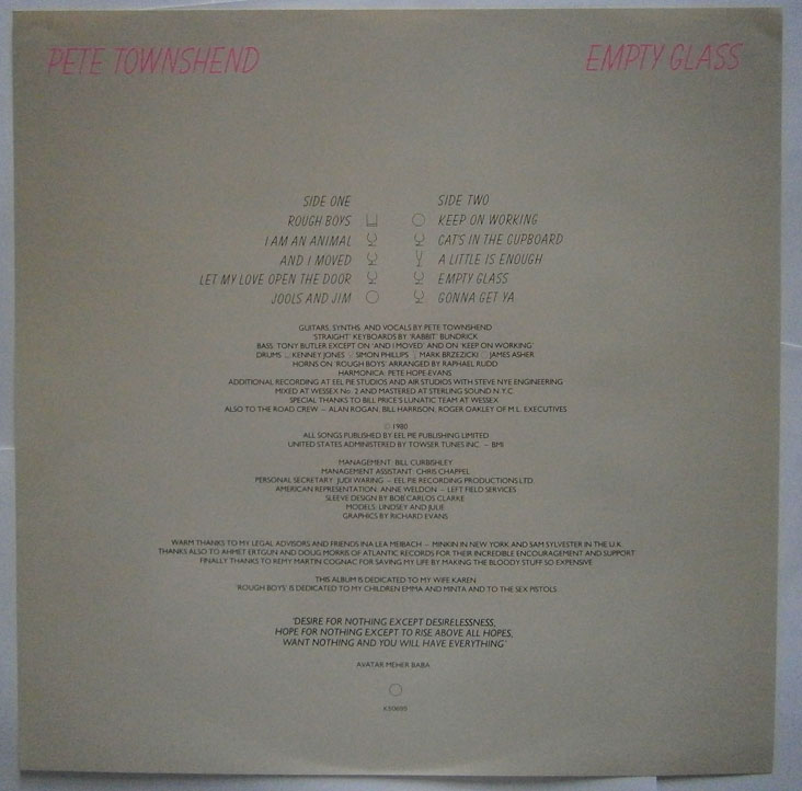 PETE TOWNSHEND / EMPTY GLASS ピート・タウンゼンド / エンプティ・グラス (LP-0102) ザ・フーのギタリスト、ピート・タウンゼントのソロアルバム「エンプティ・グラス(EMPTY GLASS)」。1980年作品。 ジャケット角にヘコミがあります。 盤区分 : LP オリジナル型番 : P-10811T 在庫状態 : 在庫有り ¥2,700(税込) 数量